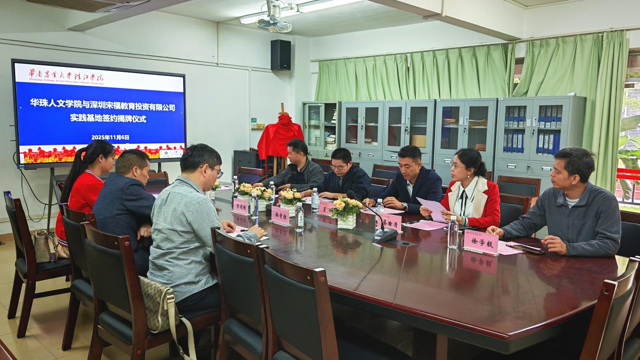 2025年11月6日,华南农业大学珠江学院人文学院、华南农业大学珠江学院新视域文化产业学院在19栋202会议室共同举办了与深圳宋福教育投资有限公司的实践基地签约揭牌仪式。人文学院院长陈军、书记袭科、副院长杨小勇、院长助理蔡瑜清、书法教研室主任徐学毅,以及深圳宋福教育投资有限公司董事长李送根、教研部部长徐孝胜、人事主管陈林等共同出席了本次活动。此次合作是学校深化产教融合、推动应用型人才培养的又一重要举措,标志着校企双方在协同育人方面迈出了实质性步伐。