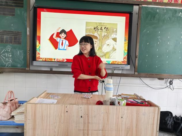 潘嘉怡老师在两个年级讲了《鸡毛信》的故事,她用自己制作的鸡毛信道具引起了学生的好奇和兴趣,详细地讲解了不同鸡毛信的重要程度,并用角色扮演的方式生动形象地演绎了这个故事。学生在课后用汉字和拼音写下的“日本鬼子真凶”“海娃真勇敢”“谢谢海娃”等文字是对烈士海娃最好的致敬。